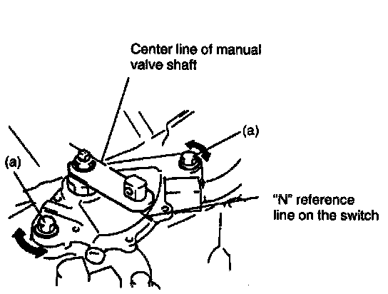 3. Check that center line on manual valve shaft and "N" reference line on switch are aligned. If not, align them according to the following procedure.