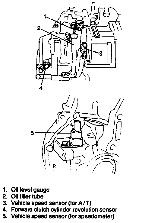 5. Remove oil level gauge, oil filler tube, vehicle speed sensor (for A/T), forward clutch cylinder revolution sensor and vehicle speed sensor (for speedometer).