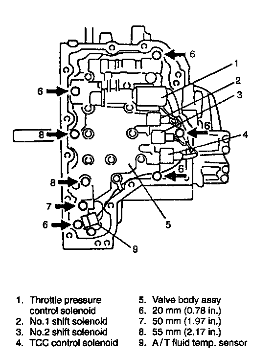 18. Remove solenoid coupler mounting bolt and remove solenoid coupler and its harness. Then remove A/T fluid temp. sensor and its harness from clamps.