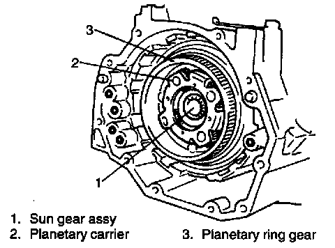 36. Remove carrier for front/ rear planetary ring gear and sun gear assembly with following integral bearing installed.