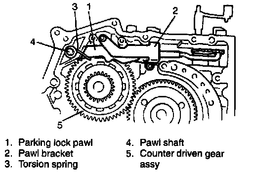 45. Remove parking lock pawl by pulling out pawl shaft with torsion spring installed.
