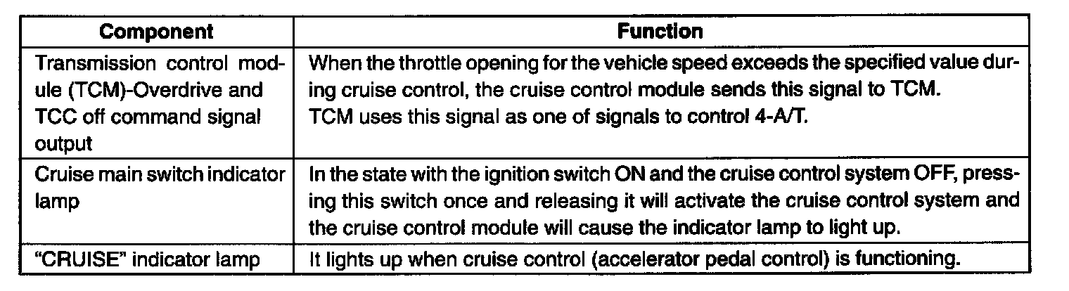 The cruise control system is a device which maintains a preset vehicle speed while driving at a high speed, e.g., on a highway. It allows the driver to drive his vehicle at a constant speed of 40 km/h (25 mile/h) or higher without depressing the accelerator pedal (constant cruising). The system also has such functions as to change the vehicle speed without operating the accelerator pedal (but using SET COAST and ACCEL RESUME switches), cancel cruise control (CANCEL switch) and resume the speed in memory automatically after cruise control is cancelled (ACCEL RESUME switch). The system mainly consists of a vehicle speed sensor, an actuator assembly incorporated with control module, cruise main switch, SET COAST switch, ACCEL RESUME switch and CANCEL switch, etc.