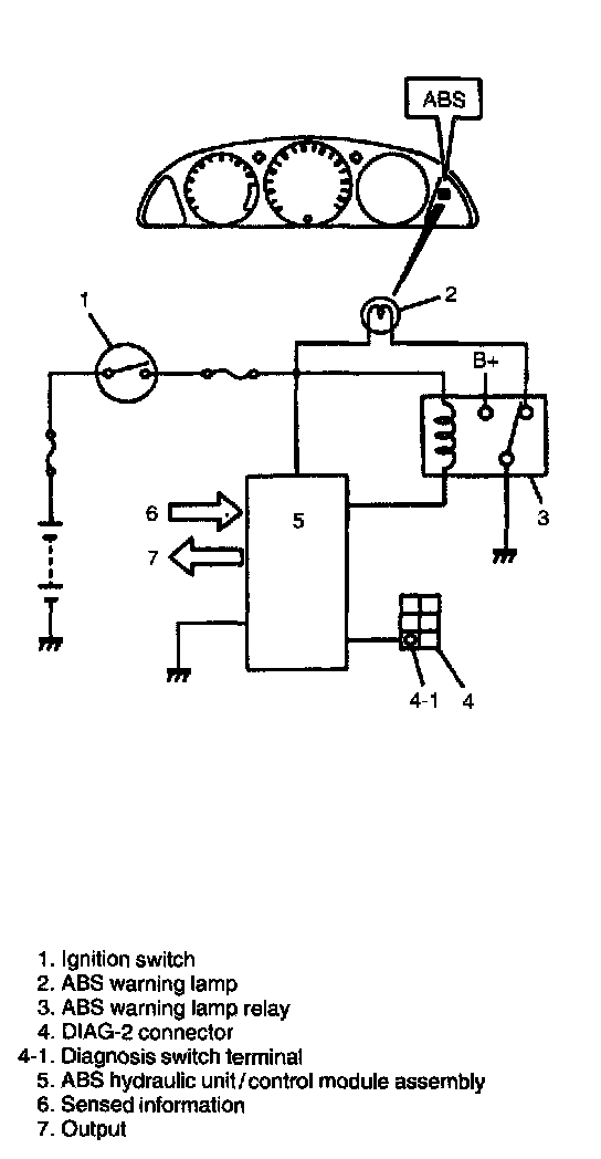 ABS control module diagnoses conditions of the system component parts (whether or not there is any abnormality) all the time and indicates the results (warning of abnormality occurrence and DTC) through the ABS warning lamp and outputs it through the diagnosis output terminal as described.