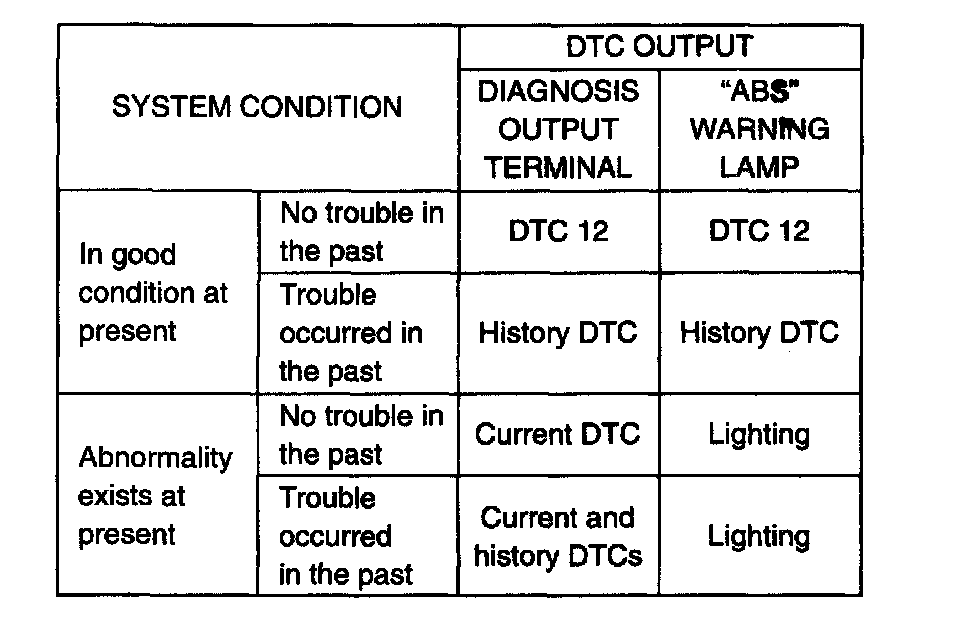 5. When diagnosis switch terminal of DIAG-2 connector (monitor connector) is grounded, the abnormal area is output as DTC from Diag. output terminal. When DTC output is normal DTC 12 or history DTC only, it is also indicated by flashing of ABS warning lamp. (Refer to the table.)