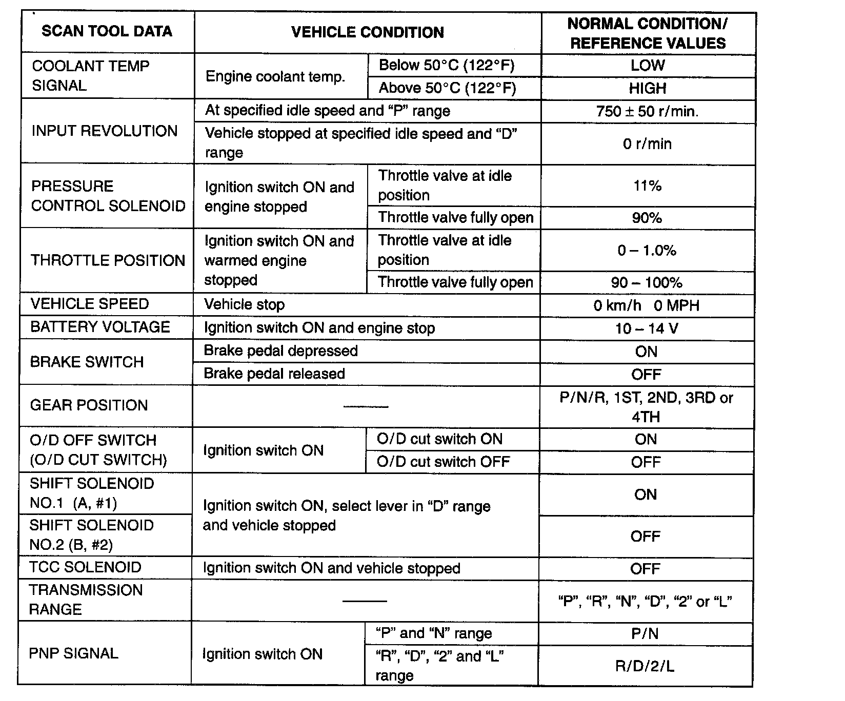 SCAN TOOL DATAAs the data values given are standard values estimated on the basis of values obtained from the normally operating vehicles using a scan tool, use them as reference values. Even when the vehicle is in good condition, there may be cases where the checked value does not fall within each specified data range. Therefore, judgment as abnormal should not be made by checking with these data alone.