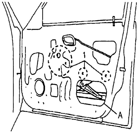 2. Remove window regulator attaching screws (1) (six pcs.). Then, take out regulator through hole (A).