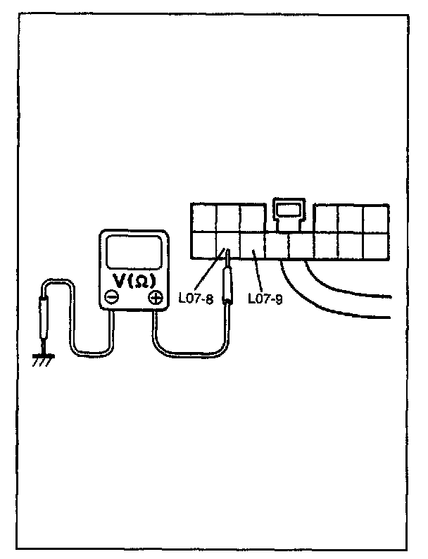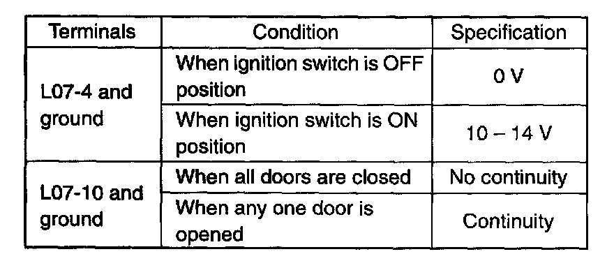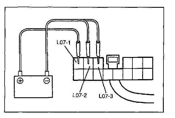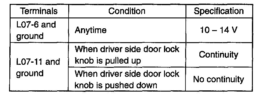 3. Use a 12 V battery to connect its (+) terminal to terminal L07-1, and its (-) terminal to terminal L07-2 and L07-3. Check all power doors are locked.