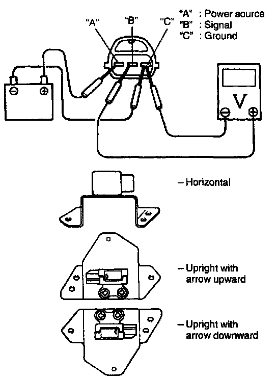 2. Connect positive cable of 12 volt battery to "A" terminal of sensor and ground cable to "C" terminal. Then using voltmeter, check voltage between "B" terminal and "C" terminal.
