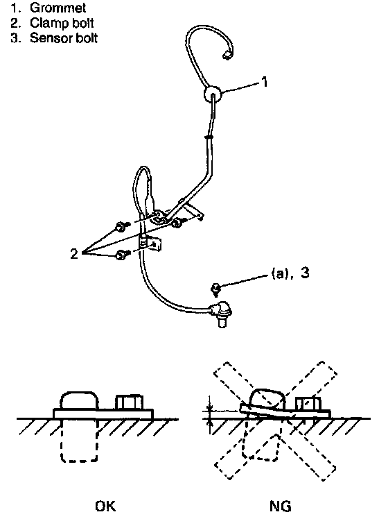 ^ Do not cause damage to surface of front wheel speed sensor and do not allow dust, etc. to enter its installation hole.