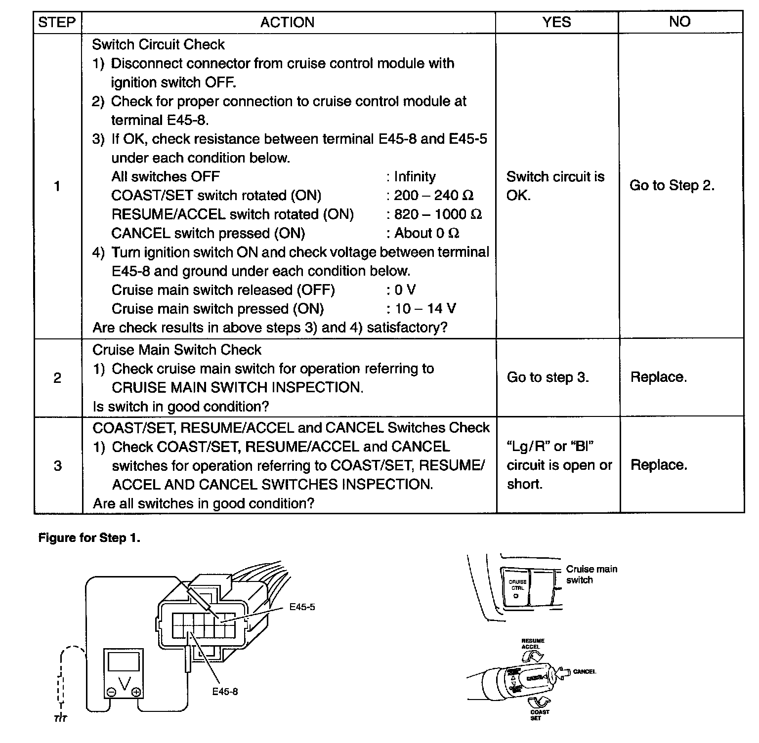 Cruise Main Switch, Coast/Set, Resume/Accel and Cancel Switches Circuit Check (Step 1 - 3):