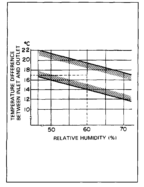As an example of 17 °C (62.6 °F) temperature difference and 60% relative humidity shown in it, if their crossing point falls within the area between two lines, cooling performance then is satisfactory and proper.