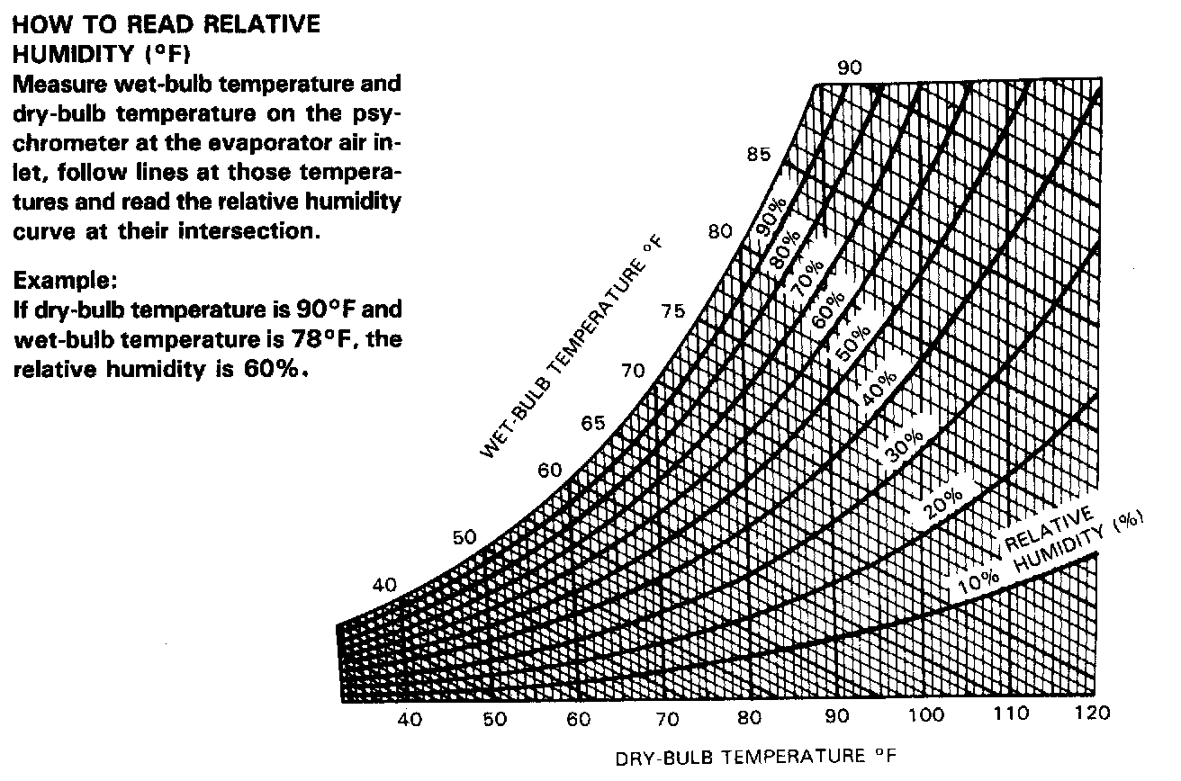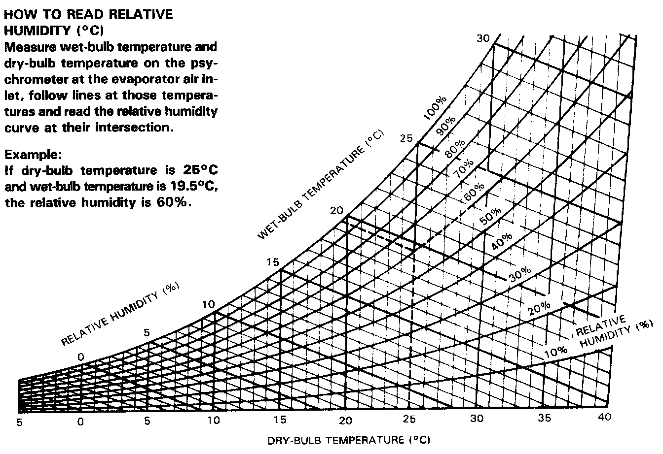 1. Read psychrometer reading at the inlet, and get relative humidity from psychrometric chart. (See figures.)
