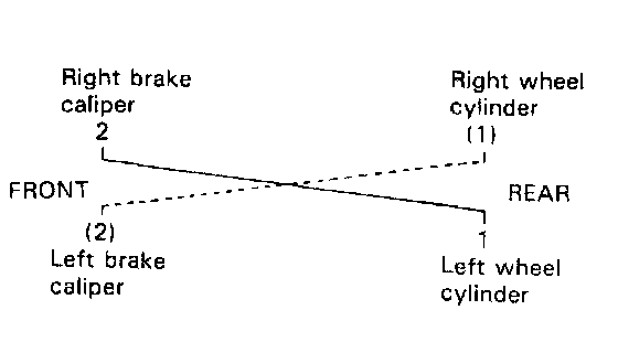 Hydraulic lines of brake system are based on the diagonal split system. When a brake pipe or hose was disconnected at the wheel, bleeding operation must be performed at both ends of the line of the removed pipe or hose. When any joint part of the master cylinder or other joint part between the master cylinder and each brake (wheel) was removed, the hydraulic brake system must be bled at all 4 wheel brakes.