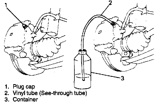 NOTE: Perform bleeding operation starting with wheel cylinder farthest from master cylinder and then at front caliper of the same brake line. Do the same on the other brake line.
