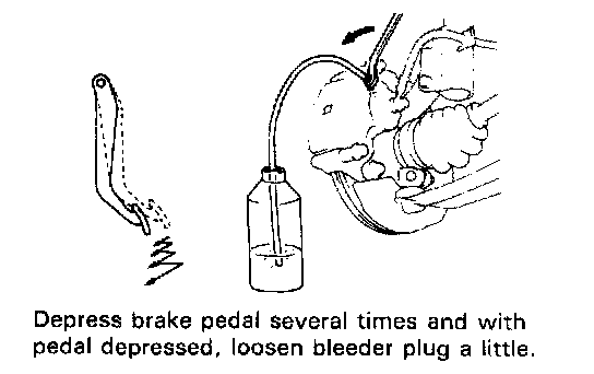 3. Depress brake pedal several times, and then while holding it depressed, loosen bleeder plug about one-third to one half turn.
