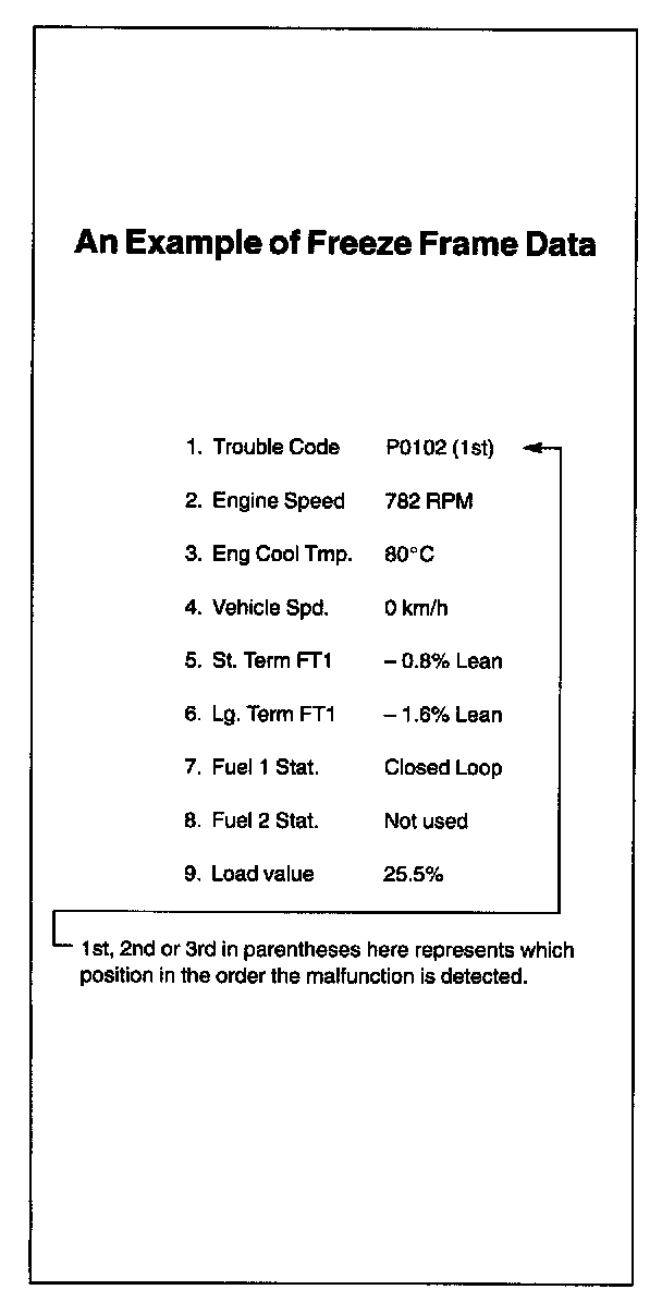 Therefore, it is possible to know engine and driving conditions (e.g., whether the engine was warm or not, where the vehicle was running or stopped, where air/fuel mixture was lean or rich) when a malfunction was detected by checking the freeze frame data. Also, ECM has a function to store each freeze frame data for three different malfunctions in the order as the malfunction is detected. Utilizing this function, it is possible to know the order of malfunctions that have been detected. Its use is helpful when rechecking or diagnosing a trouble.