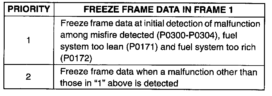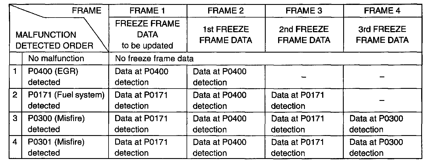 Shown in the table are examples of how freeze frame data are stored when two or more malfunctions are detected.