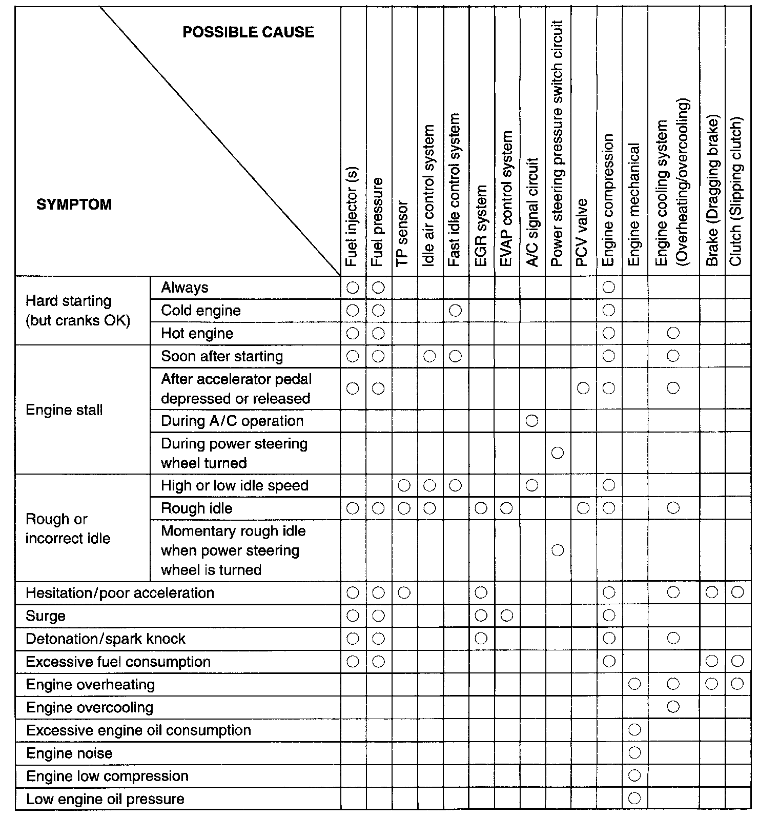 Perform troubleshooting referring to the following table when ECM has detected no DTC and no abnormality has been found in visual inspection and engine basic inspection previously.