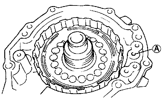 6. Remove forward clutch piston subassembly with O-rings installed through oil hole (A) using compressed air (400 - 800 kPa, 4 - 8 kg/cm2, 57 -113 psi).