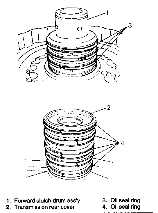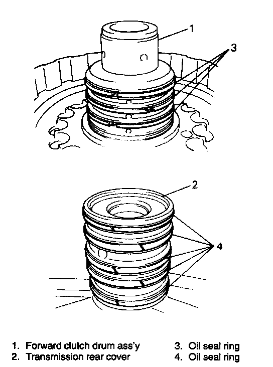 7. Remove clutch drum oil seal rings of forward clutch drum subassembly and transmission rear cover.