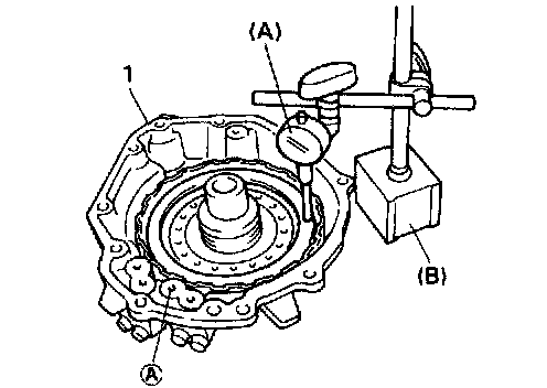 c. For 1.8 liter model, measure pack clearance while applying and releasing compressed air (170 - 230 kPa, 1.7 - 2.3 kg/cm2, 25 - 32 psi) through oil hole (1) using the same special tools as the above step b).