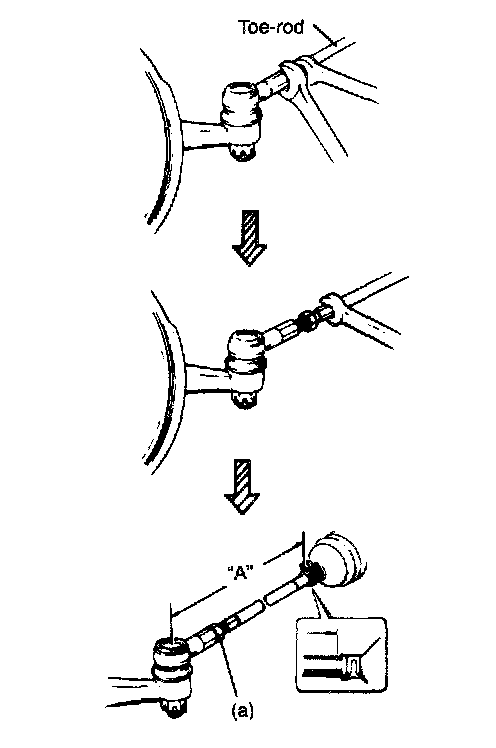 TOE ADJUSTMENTToe is adjusted by changing the tie rod length. Loosen right and left tie rod end lock nuts first and then rotate right and left tie rods by the same amount to align toe-in to specification. In this adjustment, right and left tie rods should became equal in length ("A" in left figure).