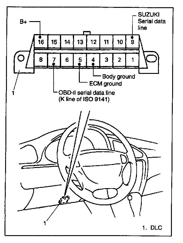 OBD-II serial data line (K line of ISO 9141.is used for SUZUKI scan tool (Tech-1.or OBD-II generic scan tool to communicate with ECM. SUZUKI serial data line is used for SUZUKI scan tool (Tech-1. to communicate with an electronic control unit other than ECM (Airbag SDM, ABS control module, etc.).