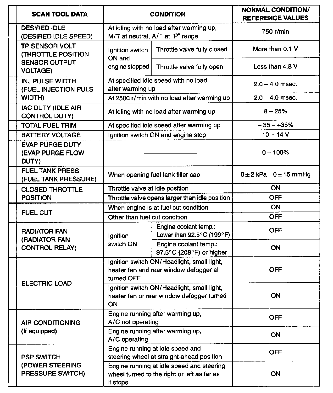 As the data values given are standard values estimated on the basis of values obtained from the normally operating vehicles by using a scan tool, use them as reference values. Even when the vehicle is in good condition, there may be cases where the checked value does not tall within each specified data range. Therefore, judgment as abnormal should not be made by checking with these data alone. Also, conditions in the table that can be checked by the scan tool are those detected by ECM and output from ECM as commands and there may be cases where the engine or actuator is not operating (in the condition) as indicated by the scan tool. Be sure to use the timing light to check the ignition timing.
