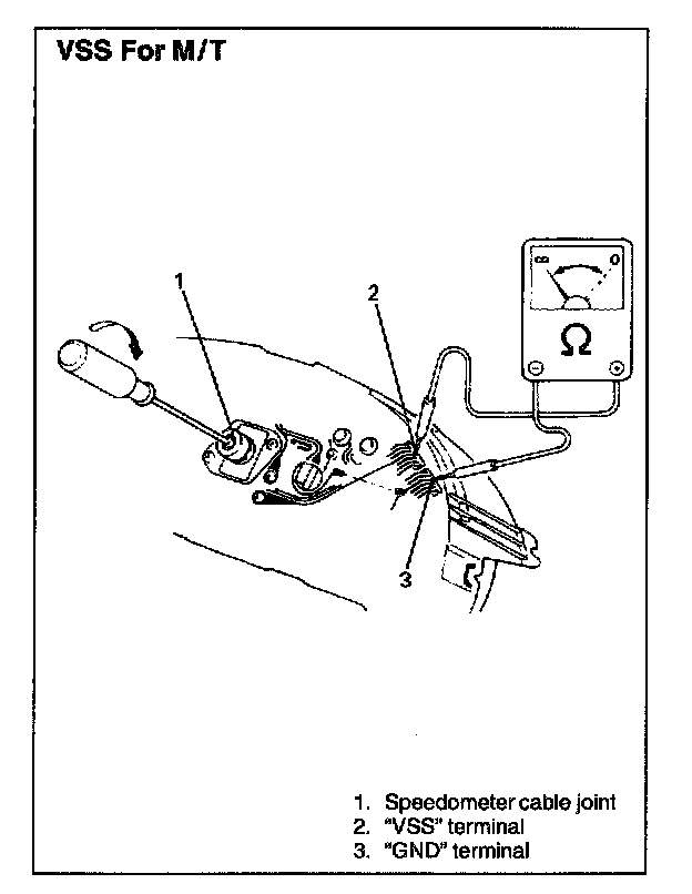 3. Connect ohmmeter between "VSS" terminal and "GND" terminal of combination meter and turn cable joint of speedometer with a screwdriver. Ohmmeter indicator should move back and forth between 0 (zero) and (infinity) 4 times while cable joint is turned one full revolution.