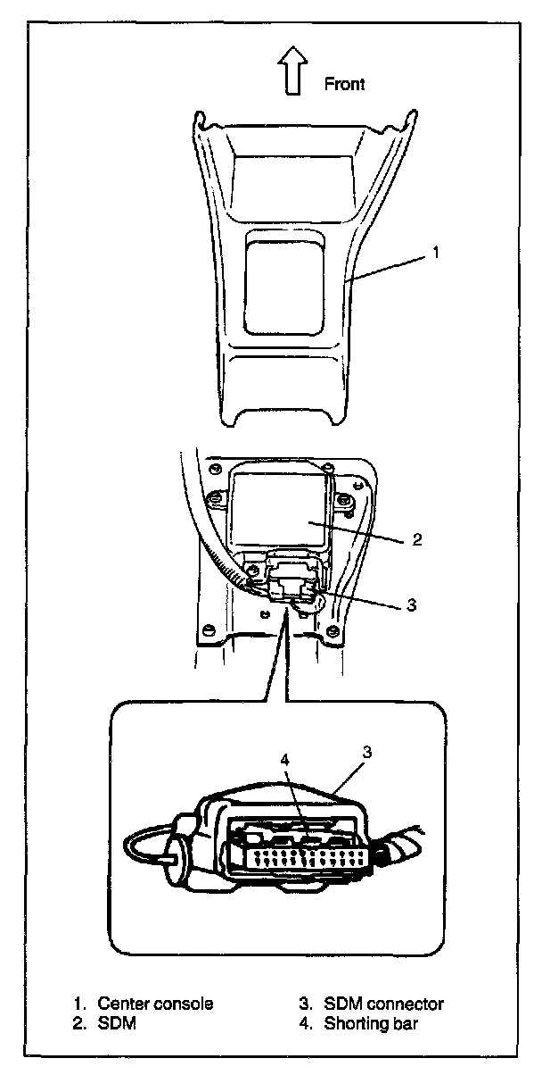 The SDM is connected to the air bag wiring harness by a 12-way connector. This harness connector uses a shorting bar across certain terminals in the contact area. This shorting bar connects the "AIR BAG" warning lamp to ground when the SDM harness connector is disconnected.