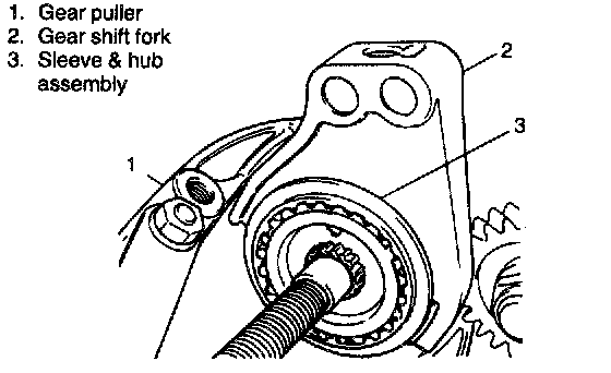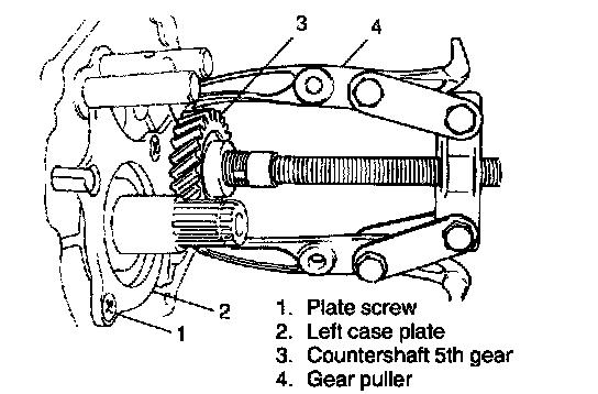 5. Remove gear shift fork, sleeve & hub assembly, synchronizer ring spring, synchronizer ring and 5th gear all together. Gear puller is required for this work.