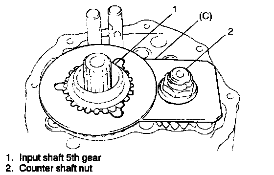 6. Unfasten caulking of countershaft nut, install main shaft 5th gear and special tool to stop rotation of shafts, and then remove countershaft nut.