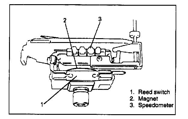 The speed sensor consists of the reed switch and magnet. It is built in the speedometer. As the magnet turns with the speedometer cable, its magnetic force causes the reed switch to turn ON and OFF. Such ON/OFF frequency increases or decreases in proportion with the vehicle speed and is sent to ECM (PCM) as pulse signals.