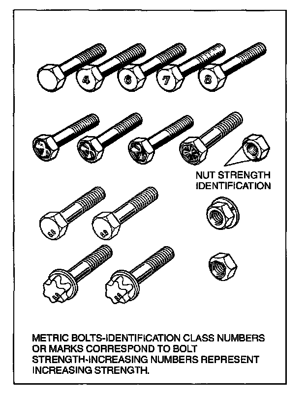 When replacing metric fasteners, be careful to use bolts and nuts of the same strength or greater than the original fasteners (the same number marking or higher). It is likewise important to select replacement fasteners of the correct diameter and thread pitch. Correct replacement bolts and nuts are available through the parts division.