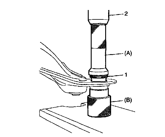 1. Press-fit suspension frame bushings (1) by using special tools (A), (B) and hydraulic press (2).