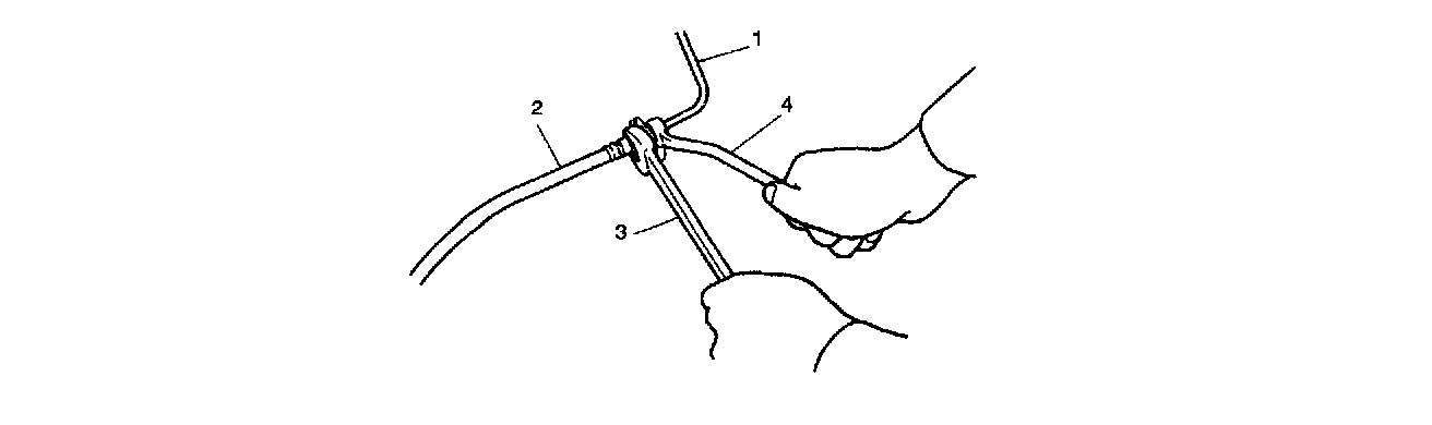 NOTE: To disconnect pipe (1) from hose (2), separate them by using flare nut wrench (4) and spanner (3) so as not to kink them.