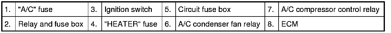Disconnect A/C compressor control relay (1) from fuse / relay box with ignition switch turn OFF.