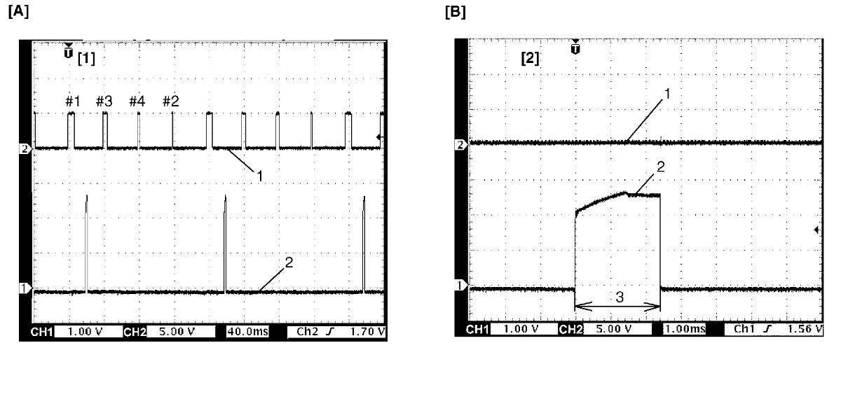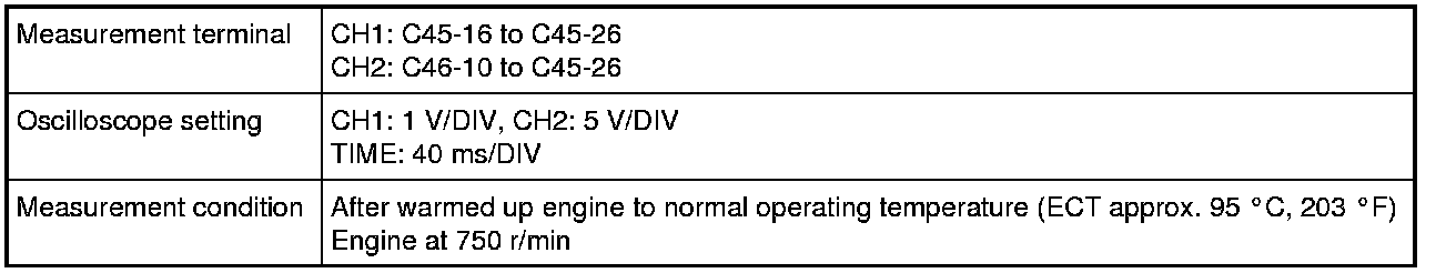 Oscilloscope waveforms of CMP sensor (1) and No.1 ignition trigger signal (2) are as shown in figure when connecting oscilloscope between terminals C46-10 of ECM connectors connected to ECM and ground, and between terminal C45-16 and ground.