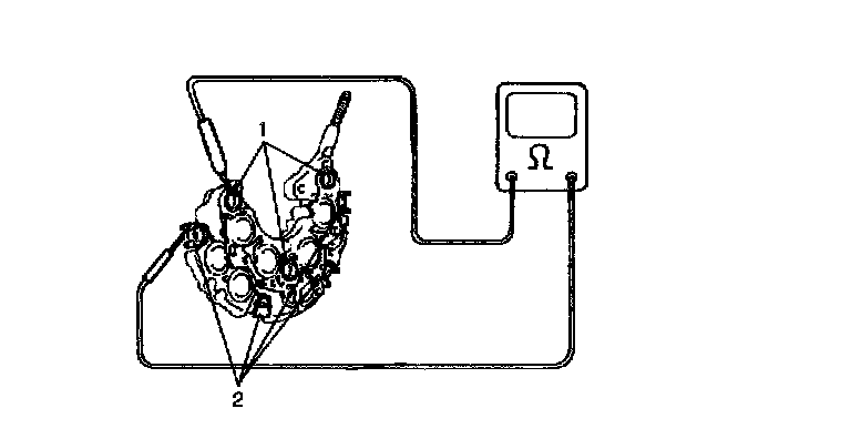 Rectifier1. Using an ohmmeter, connect one tester probe to the "B" terminal (1) and the other to each rectifier terminal (2).