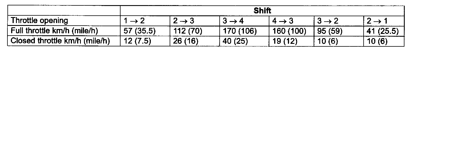Automatic shift schedule as a result of shift control is shown in the following. In case that selector lever is shifted to L at a higher than 57 km/h (35.5 mph) speed, 2nd gear is operated and then down shifts to 1st at a speed lower than that.