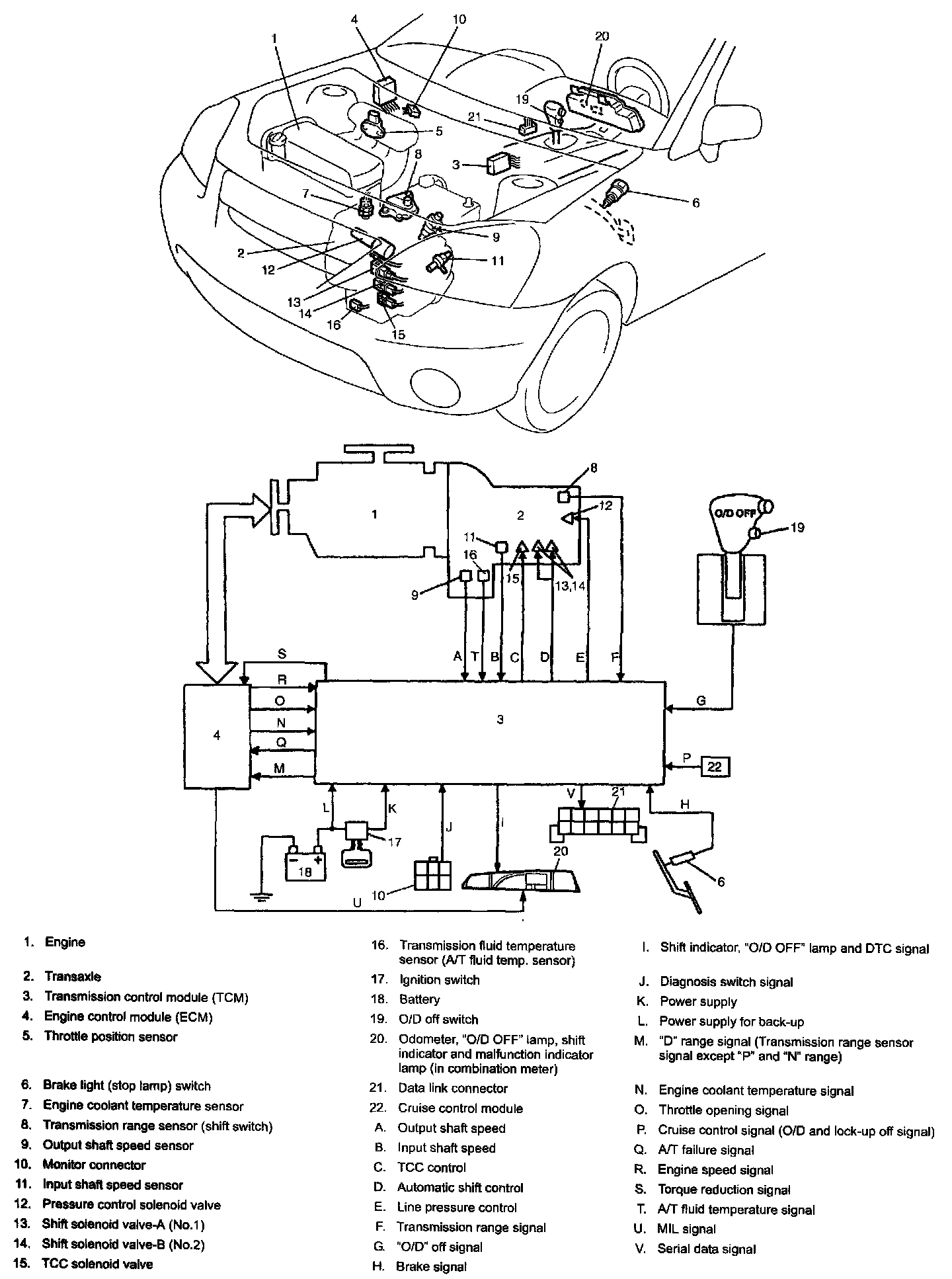 Transaxle Control Module (TCM) Wiring DiagramThe TCM is an electronic circuit component that controls gear shift and idle-up according to the signal from each sensor. It is a microcomputer of an IC, transistor, diode, etc. It is installed at the right side of the steering column.