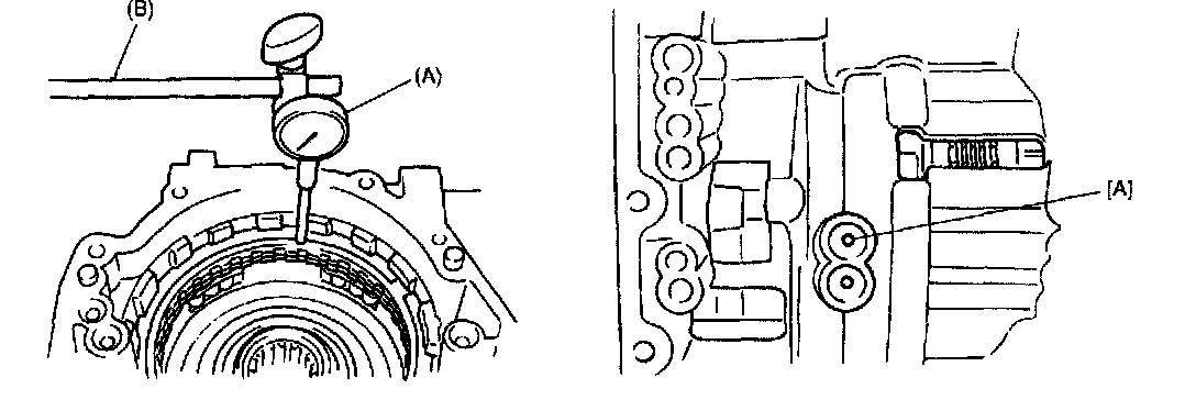 Measure 1st and reverse brake piston stroke by applying and releasing compressed air (400 - 800 kPa, 4 - 8 kgf/cm2, 57 - 113 psi) through oil hole section [A].