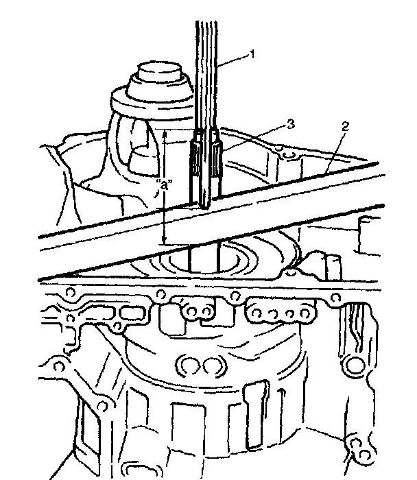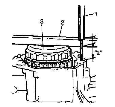 Measure the distance "a" by using vernier (1) and straightedge (2). If out of specification, remove input shaft (3) with reverse clutch assembly and reinstall them properly.