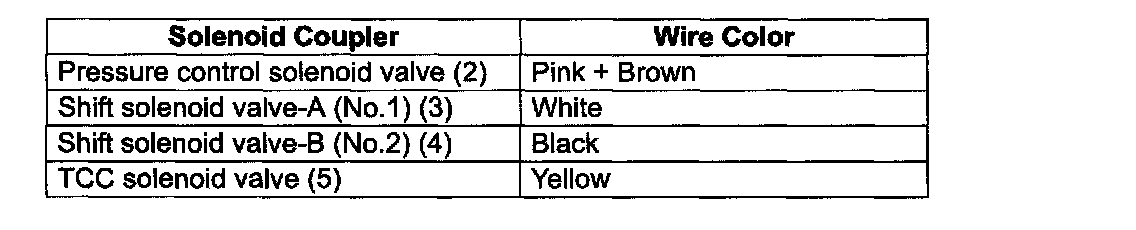 72. Connect couplers of solenoids by identifying wire color shown in the following table and install transmission fluid temperature sensor (6) to its clamp (7).