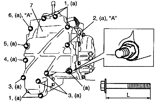 76. Install transaxle side cover (7) with bolts referring to length in the following table.