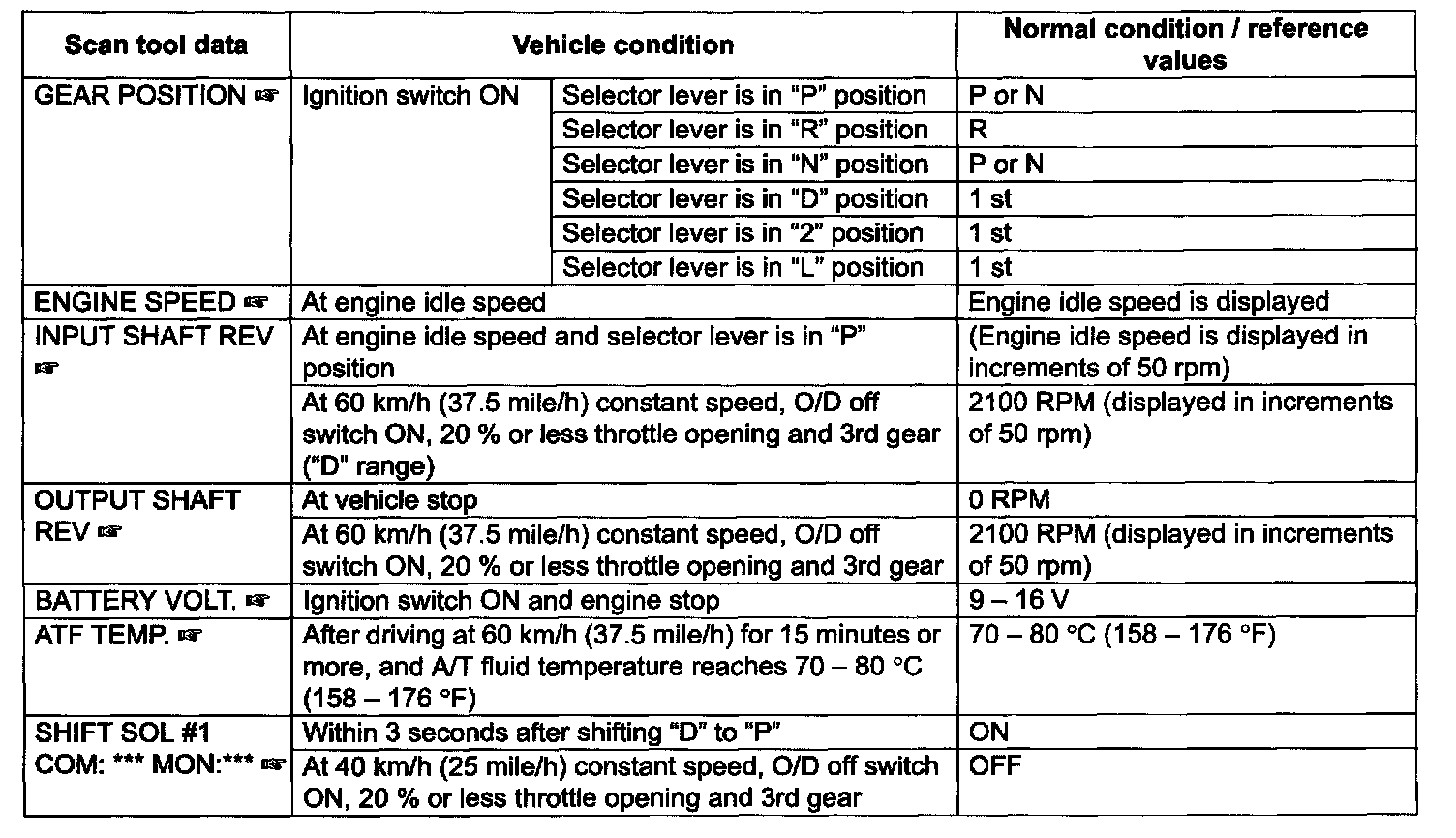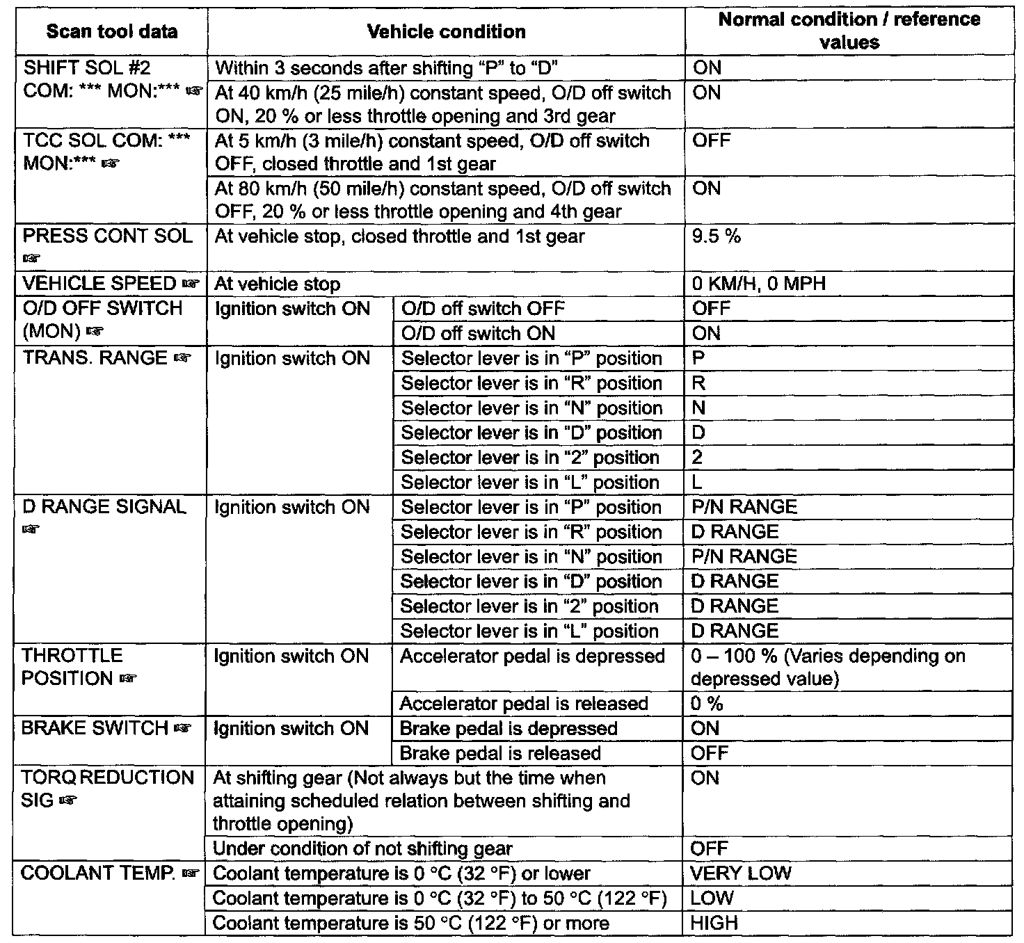 Also, condition in the following table that can be checked by the scan tool are those detected by TCM and output from TCM as commands and there may be cases where the automatic transaxle or actuator is not operating (in the condition) as indicated by the scan tool.