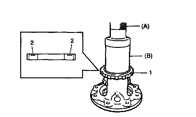 5. Press-fit new sensor rotor (1) with groove (2) side upward as shown by using special tools and copper hammer.
