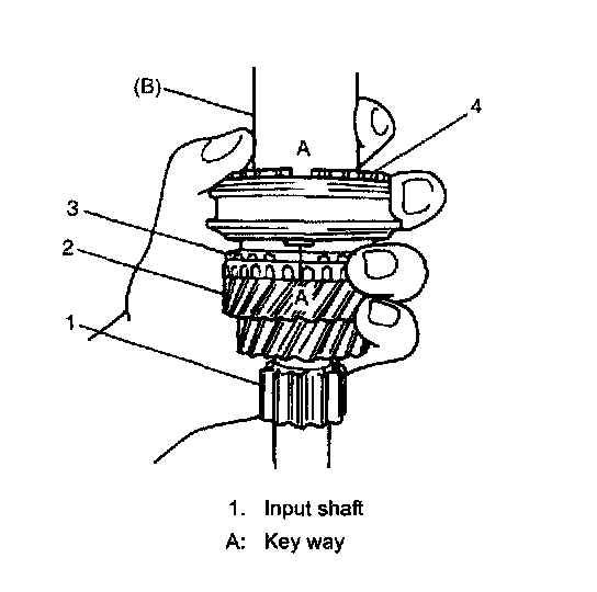 4. Fit high speed synchronizer sleeve (4) to hub (3), insert 3 keys (2) in it and then set springs (1) as shown in figure.