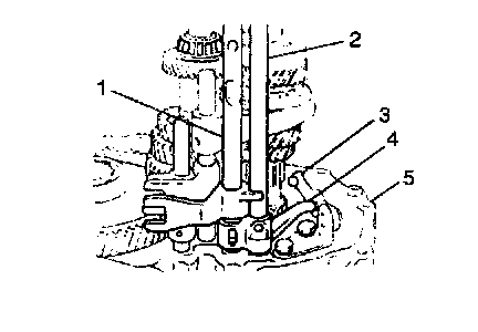 2. Install 5th & reverse gear shift shaft (1) with 5th & reverse gear shift guide shaft (2) into right case (5). Reverse gear shift arm (4) has to be joined with reverse gear shift lever (3) at the same time.