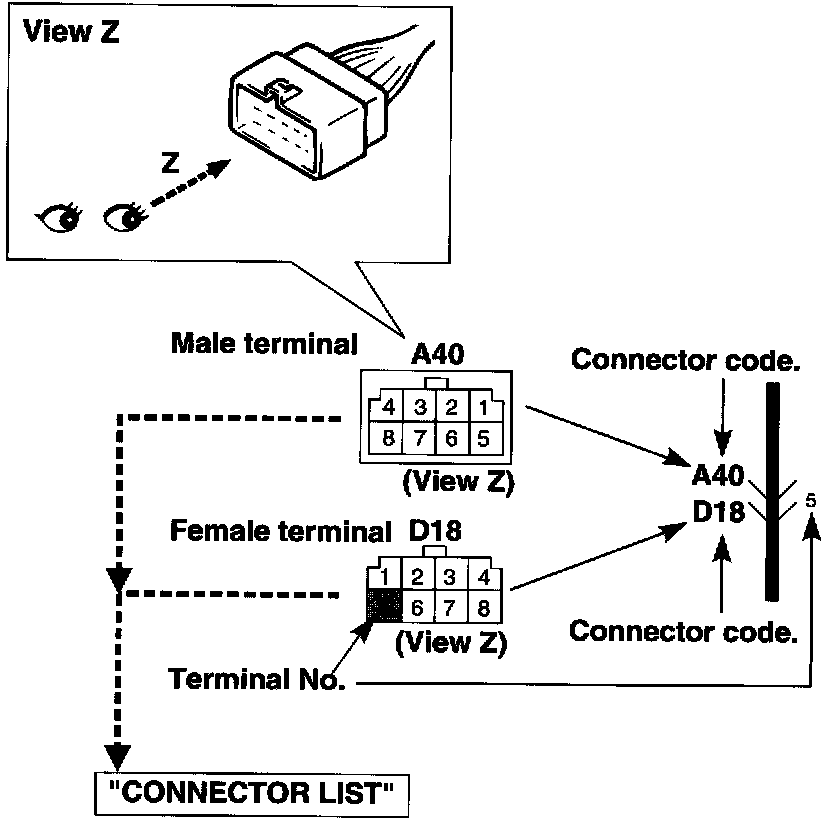 - The connector shape and terminal layout shown are those when viewed from "Z" in the illustration. Refer to "List of Connectors:".